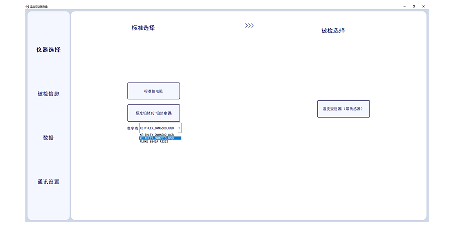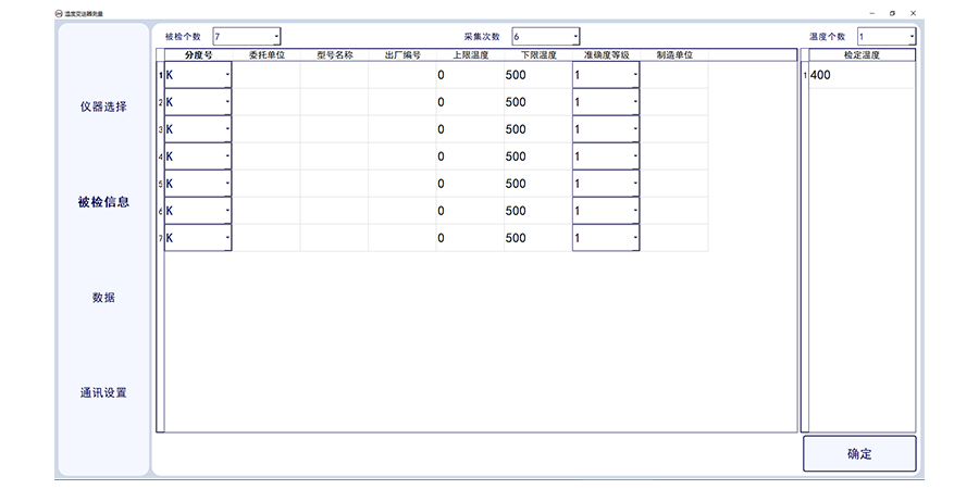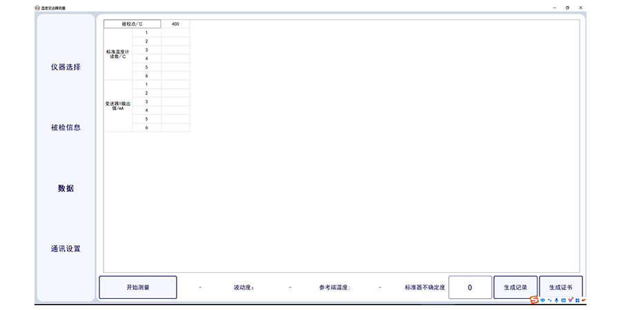 溫度變送器計(jì)量校準(zhǔn)上位機(jī)軟件,此軟件適合溫度變送器的輸出電流采集,軟件需要溫度變送器(帶傳感器)配套標(biāo)準(zhǔn)器、恒溫設(shè)備及相應(yīng)數(shù)字萬用表。軟件可選擇多個(gè)被檢傳感器,可設(shè)置采集次數(shù),及溫度個(gè)數(shù)及溫度點(diǎn)。軟件可輸入委托單位,型號(hào)名稱出廠編號(hào)及準(zhǔn)確度等級(jí)及制造單位。