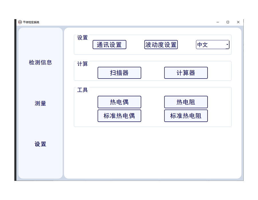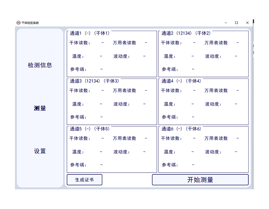 測量狀態(tài)可進(jìn)行多通道狀態(tài)干體爐,萬用表讀數(shù)。當(dāng)前標(biāo)準(zhǔn)器溫度,溫度波動(dòng)性等數(shù)據(jù)的讀取,并一鍵生成證書。可實(shí)現(xiàn)一鍵中英文切換。
