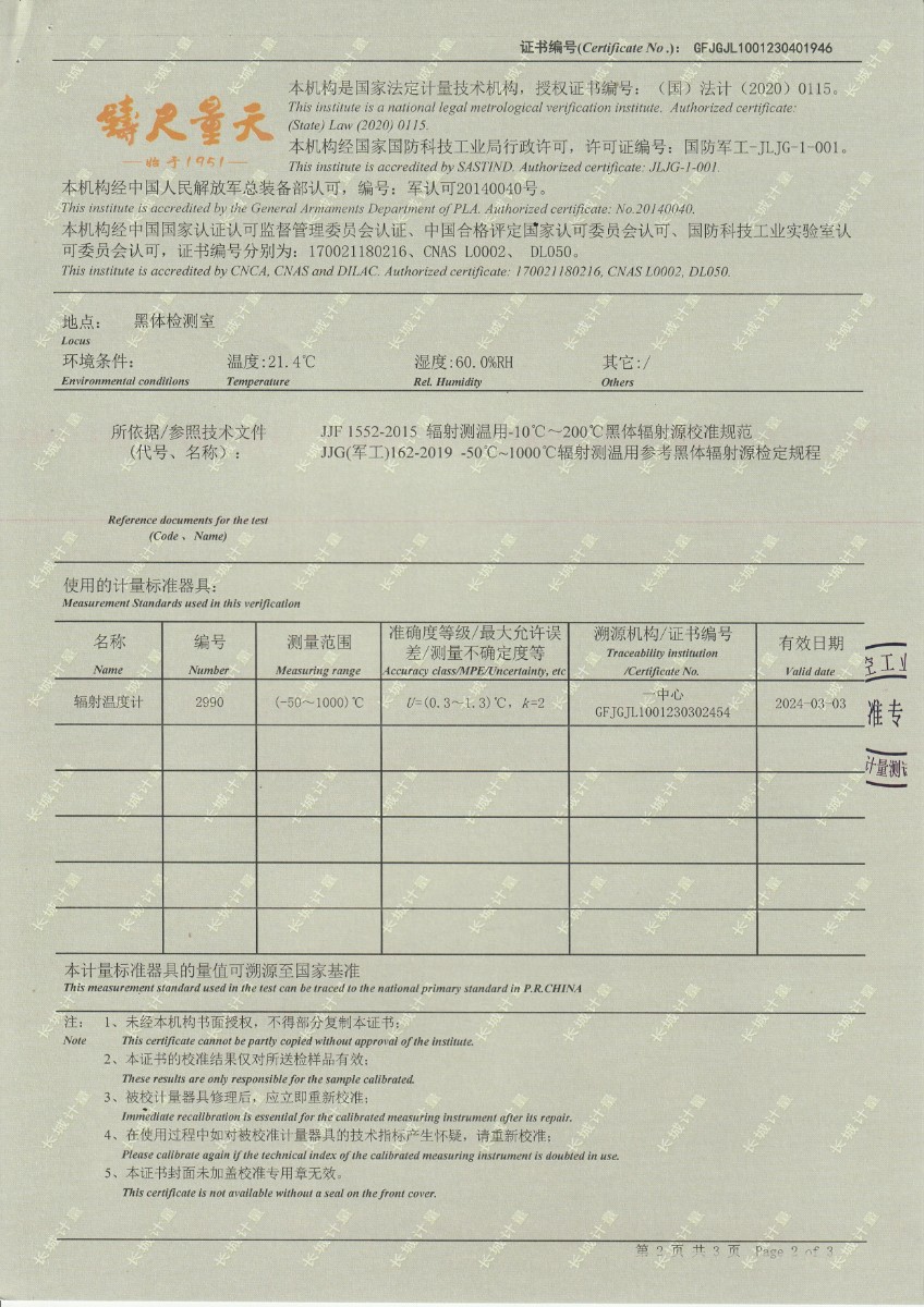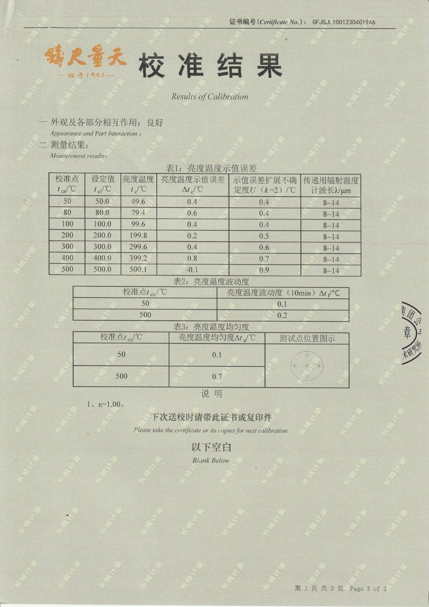 上一條:無(wú)錫英菲感知技術(shù)有限公司 高溫黑體 校準(zhǔn)證書(1) | 下一條:超低溫面源黑體爐(-40-80℃)校準(zhǔn)證書 |