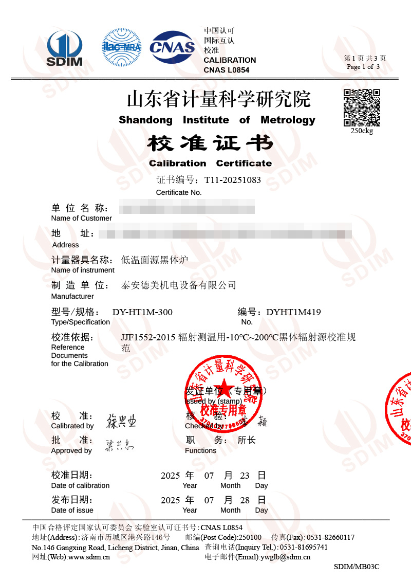 低溫面源黑體爐(0-60℃)校準證書 2025-7-28 本文被閱讀 1839 次