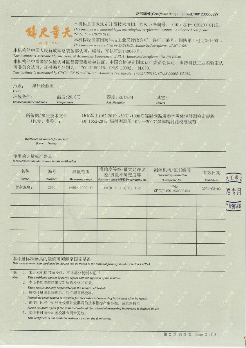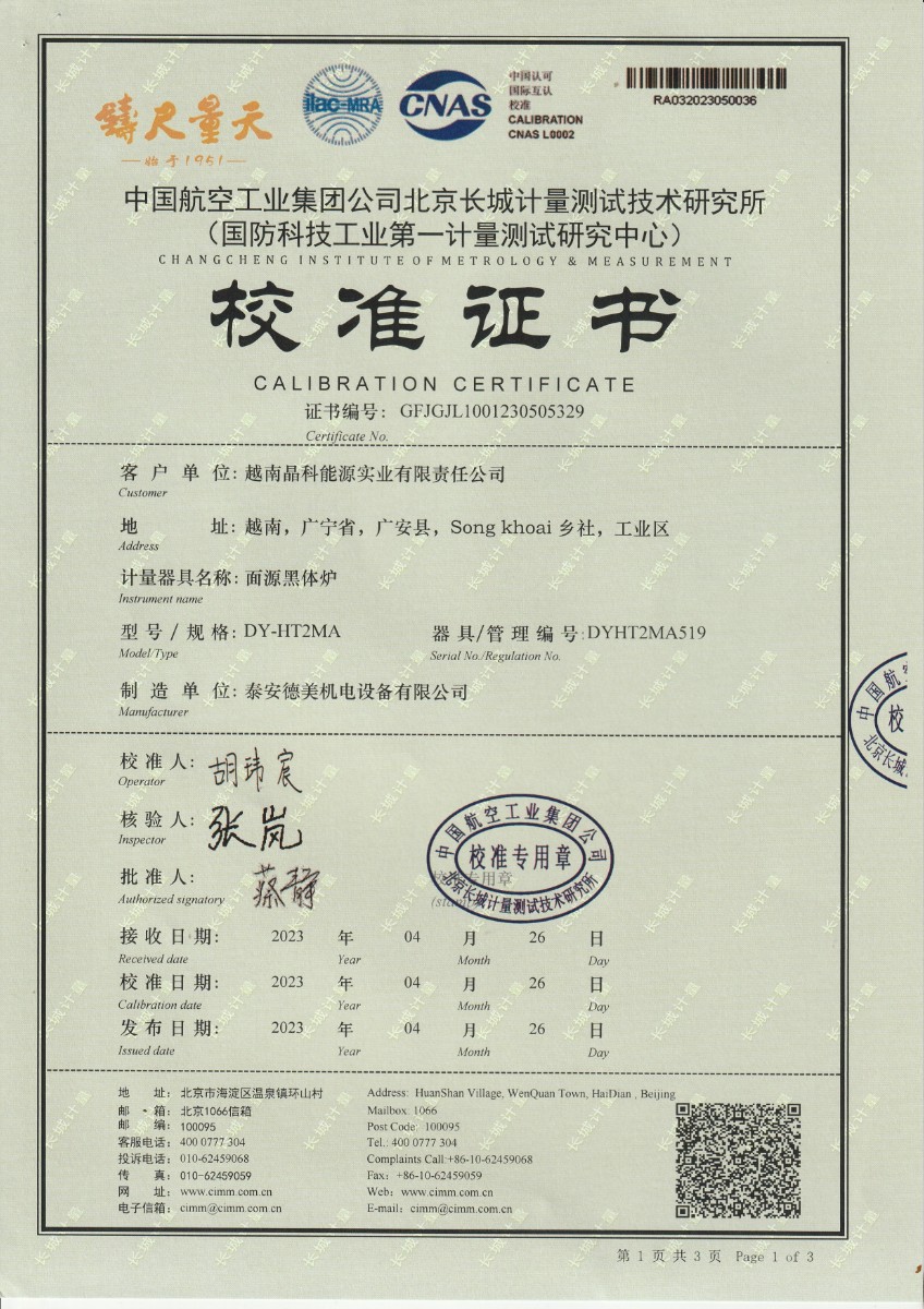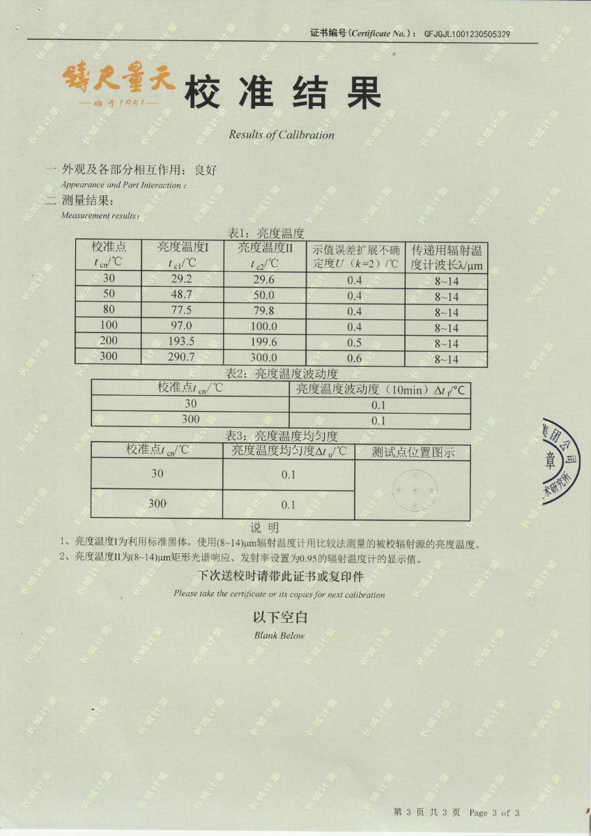 | 上一條:淮安捷泰新能源科技有限公司 黑體輻射源 校準(zhǔn)證書 | 下一條:便攜式干體爐(-30-150℃)校準(zhǔn)證書 |