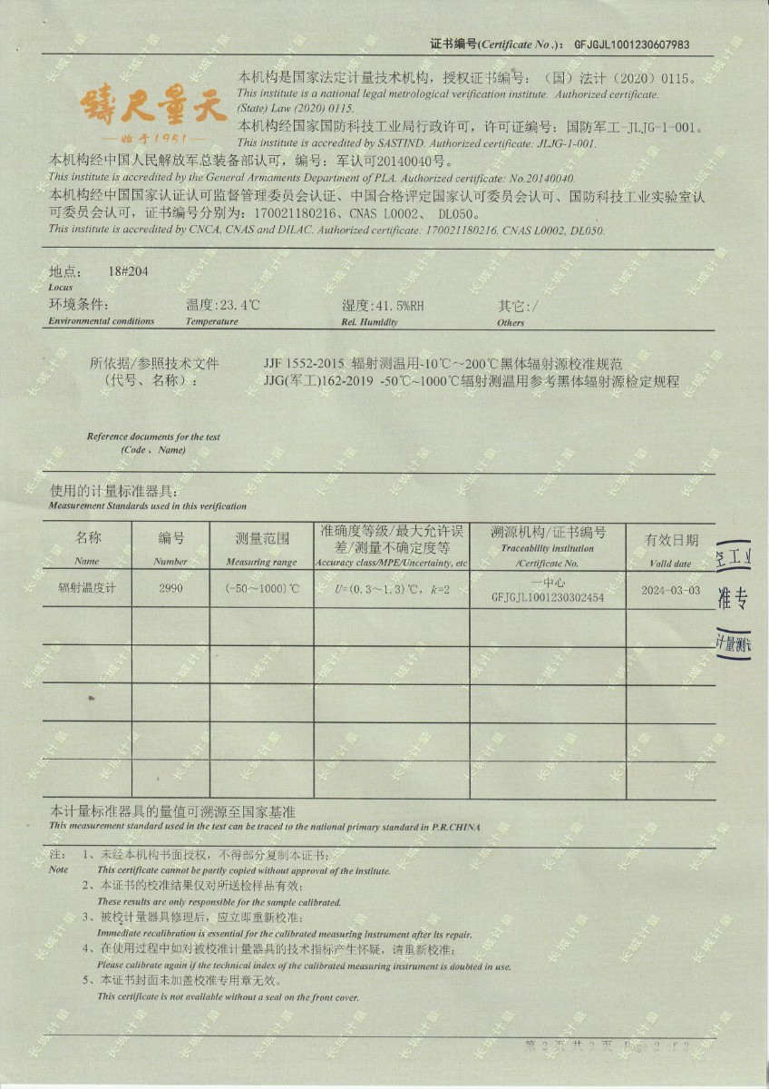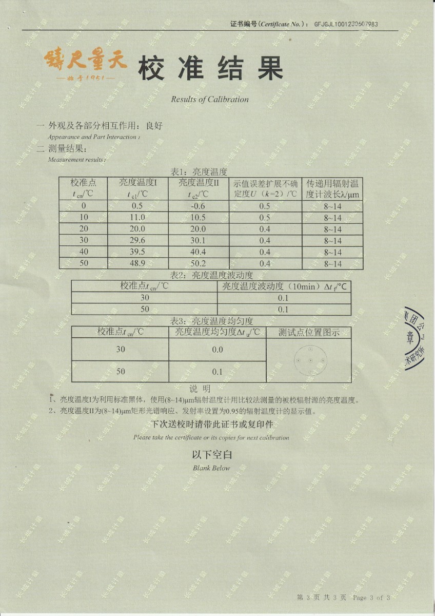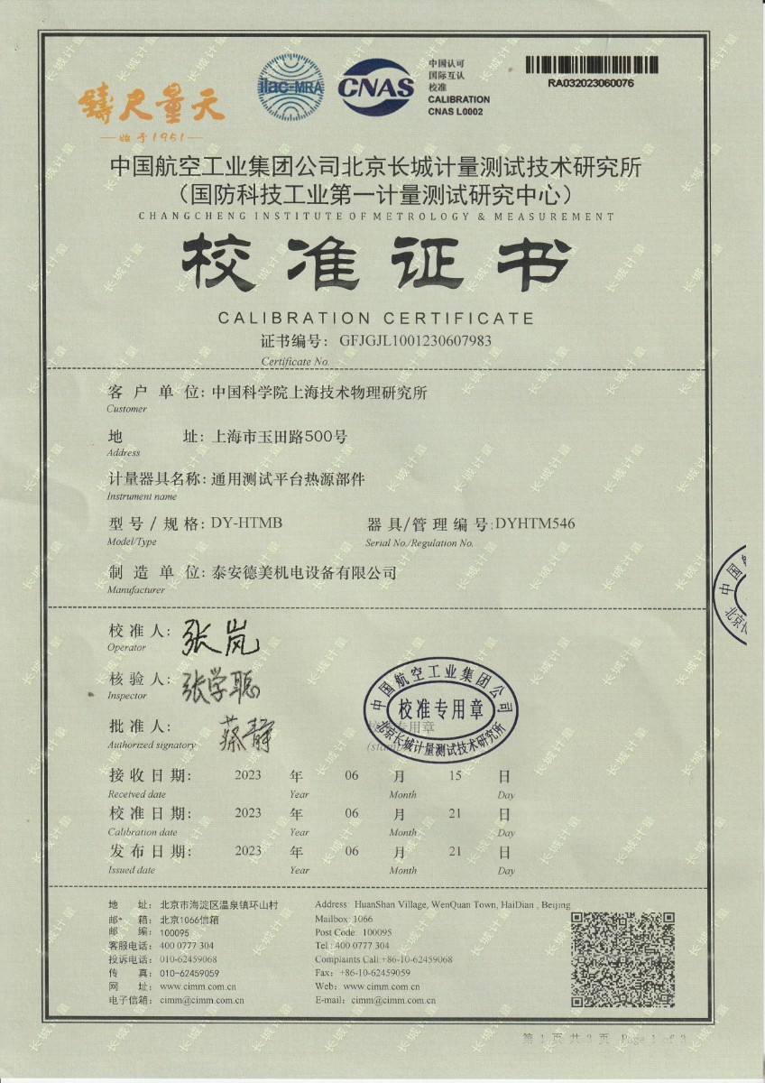 上一條:中國科學(xué)院上海技術(shù)物理研究所-通用測試平臺(tái)熱源部件(DYHTM545) | 下一條:超低溫面源黑體爐(-40-80℃)校準(zhǔn)證書 |