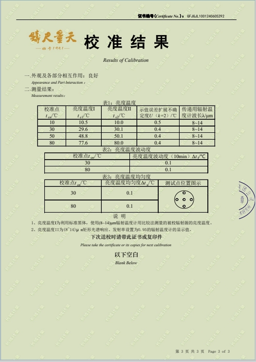 面源黑體輻射源(0-80℃)304所校準(zhǔn)證書