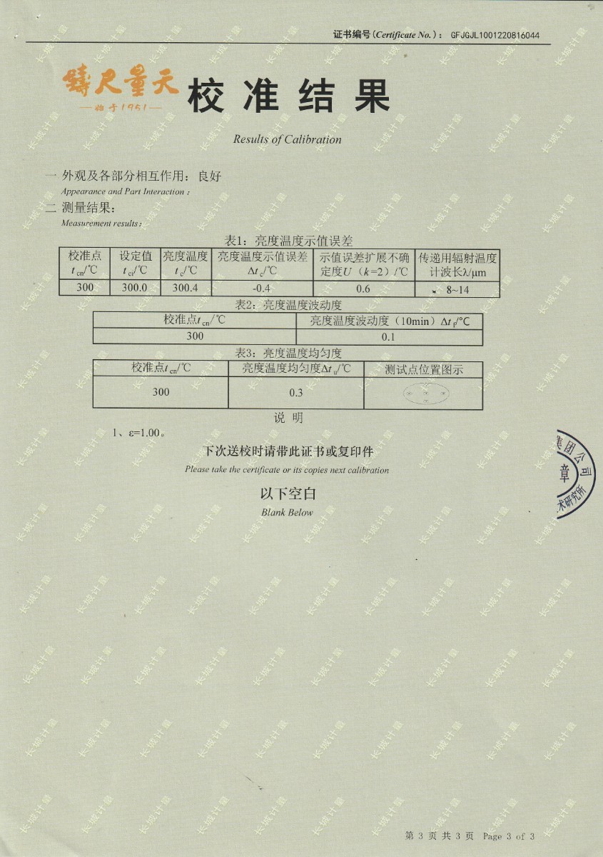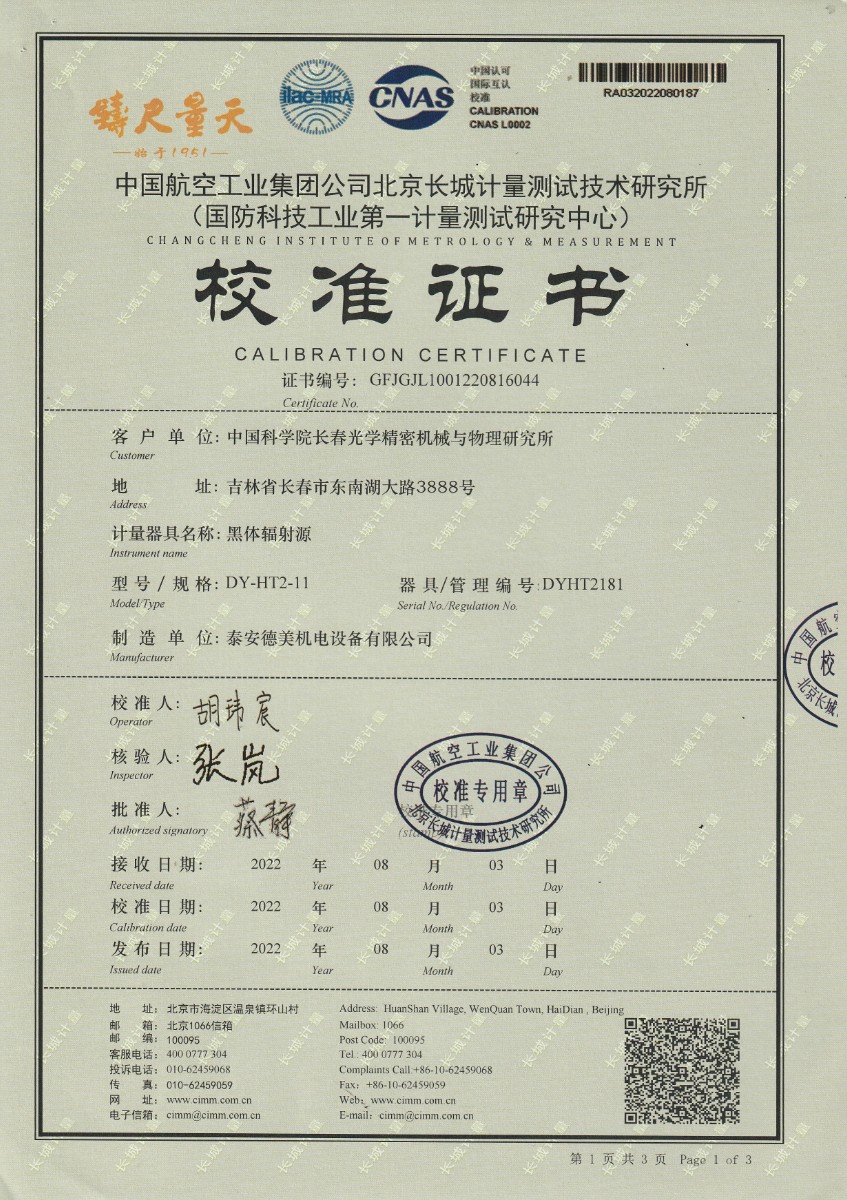 上一條:中國(guó)科學(xué)院長(zhǎng)春光學(xué)精密機(jī)械與物理研究所-黑體爐DY-HT2-2 | 下一條:超低溫面源黑體爐(-40-80℃)校準(zhǔn)證書(shū) |