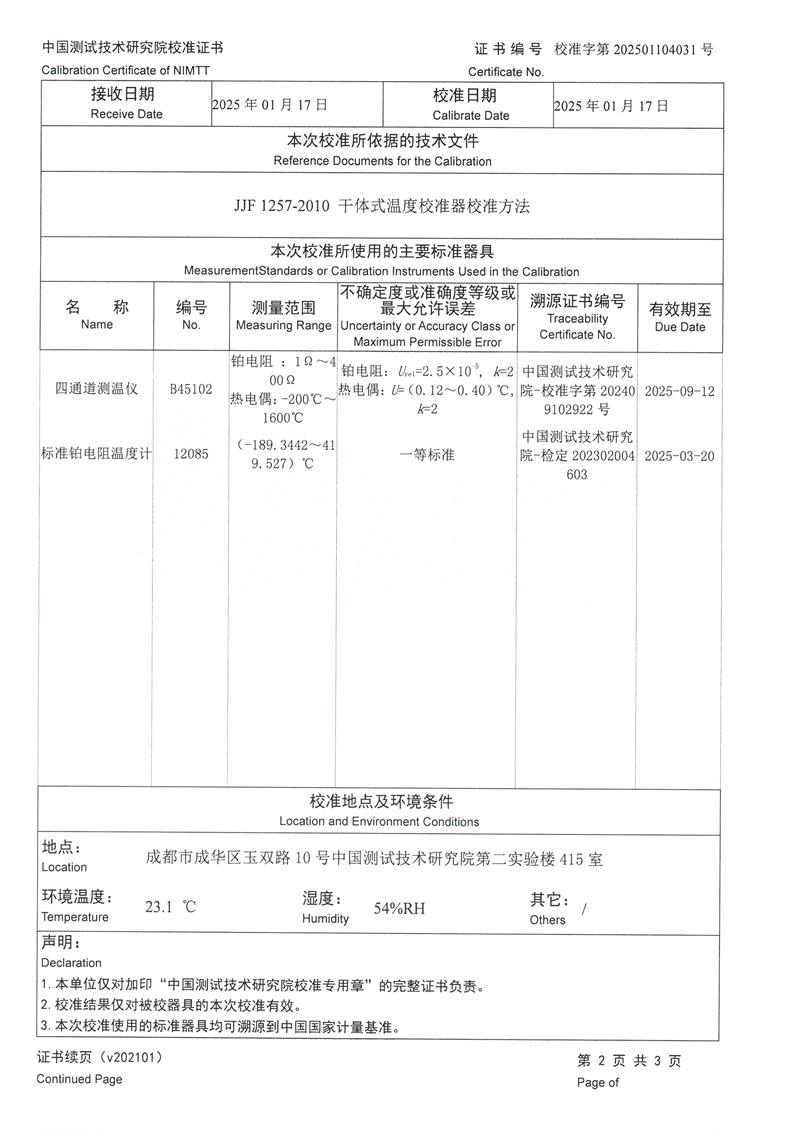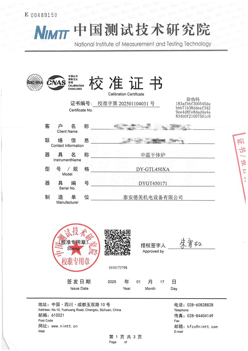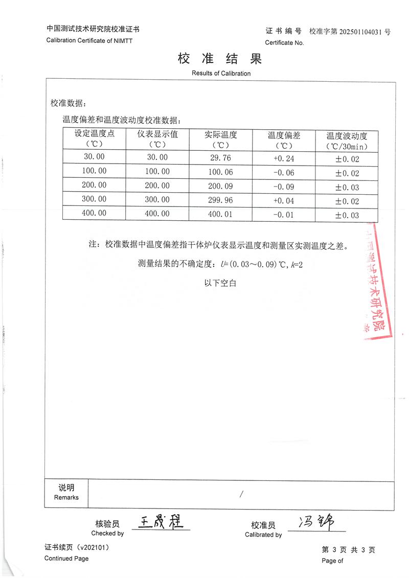 中溫干體爐(室溫+5~400℃)校準證書 2025-1-20 本文被閱讀 4672 次
