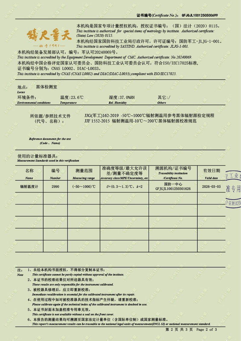 上一條:腔式黑體輻射源(50-700℃)校準(zhǔn)證書下一條:超低溫面源黑體爐(-40-80℃)校準(zhǔn)證書