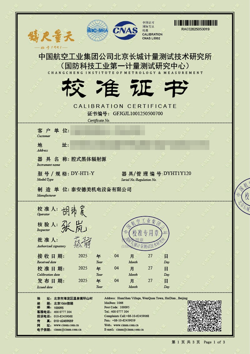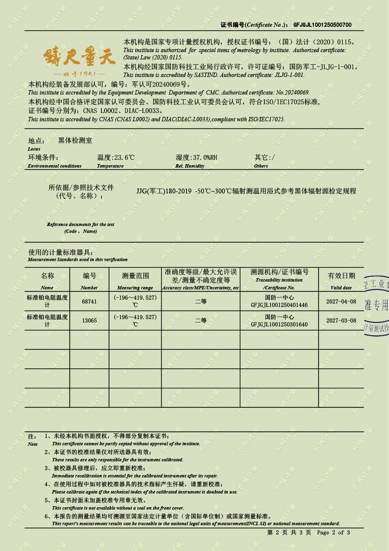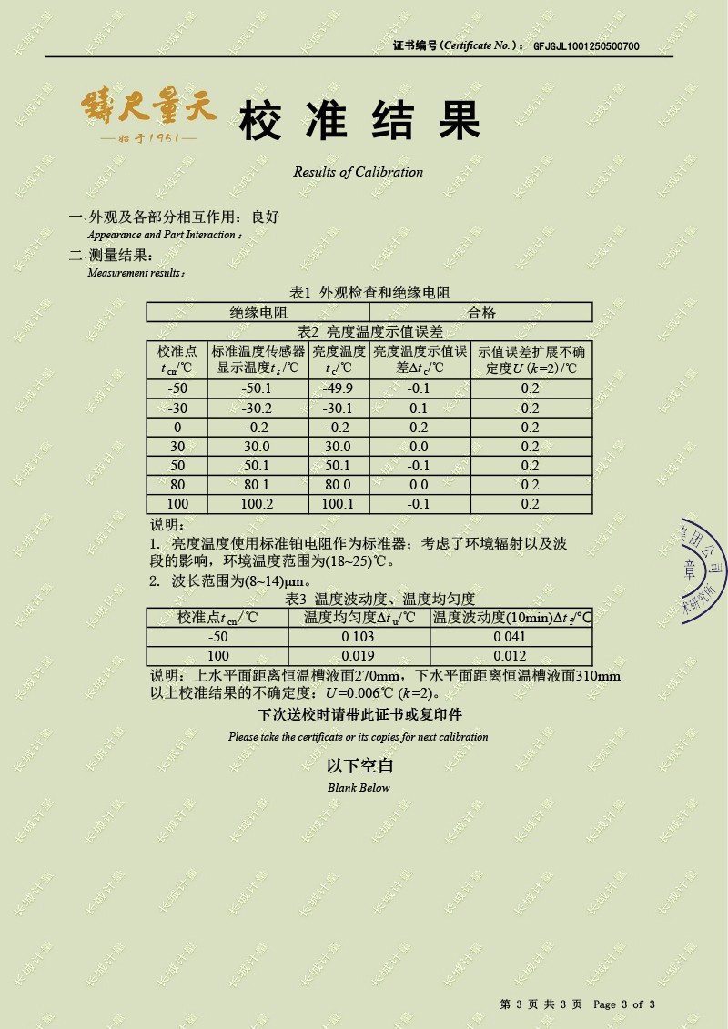 腔式黑體輻射源(-50-100℃)校準證書 2025-5-9 本文被閱讀 2498 次
