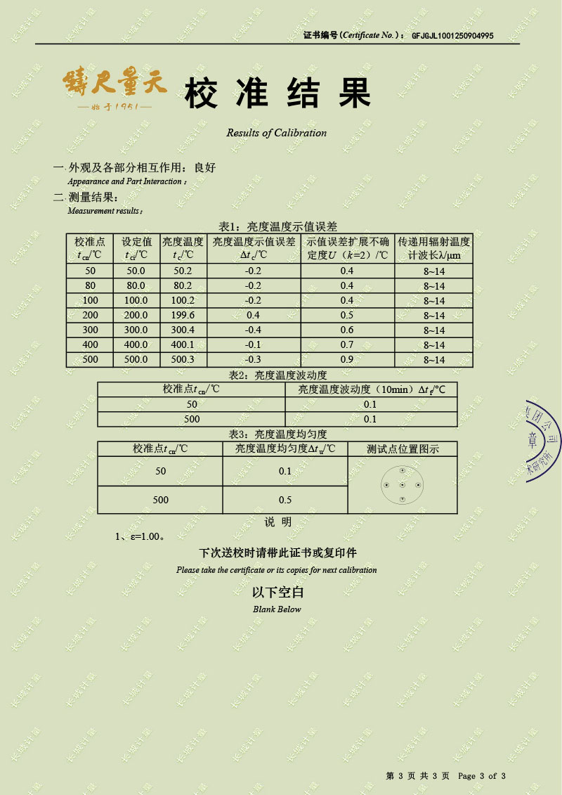 黑體輻射源(50-500℃)校準(zhǔn)證書