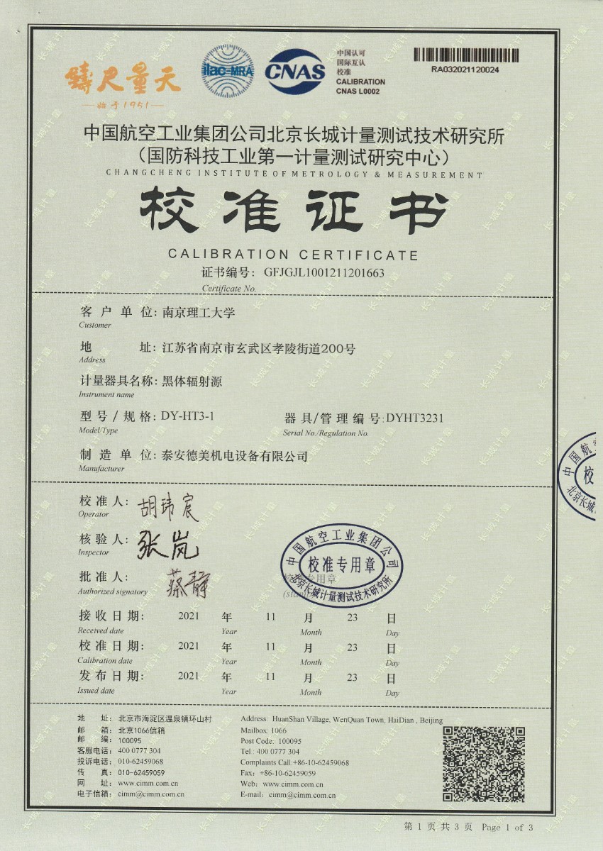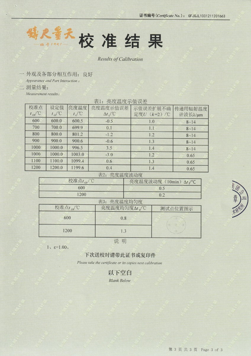 上一條:南京理工大學(xué)-黑體輻射源校準(zhǔn)證書350-800℃ | 下一條:便攜式干體爐(-30-150℃)校準(zhǔn)證書 |