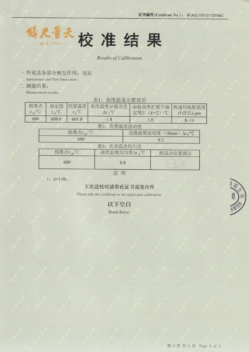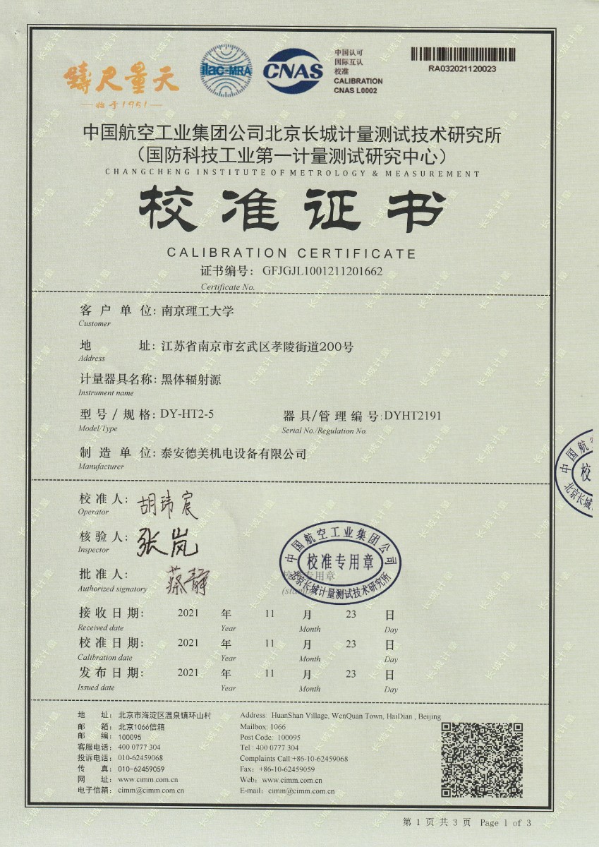 南京理工大學-黑體輻射源校準證書600℃ 2021-12-4 本文被閱讀 13907 次
