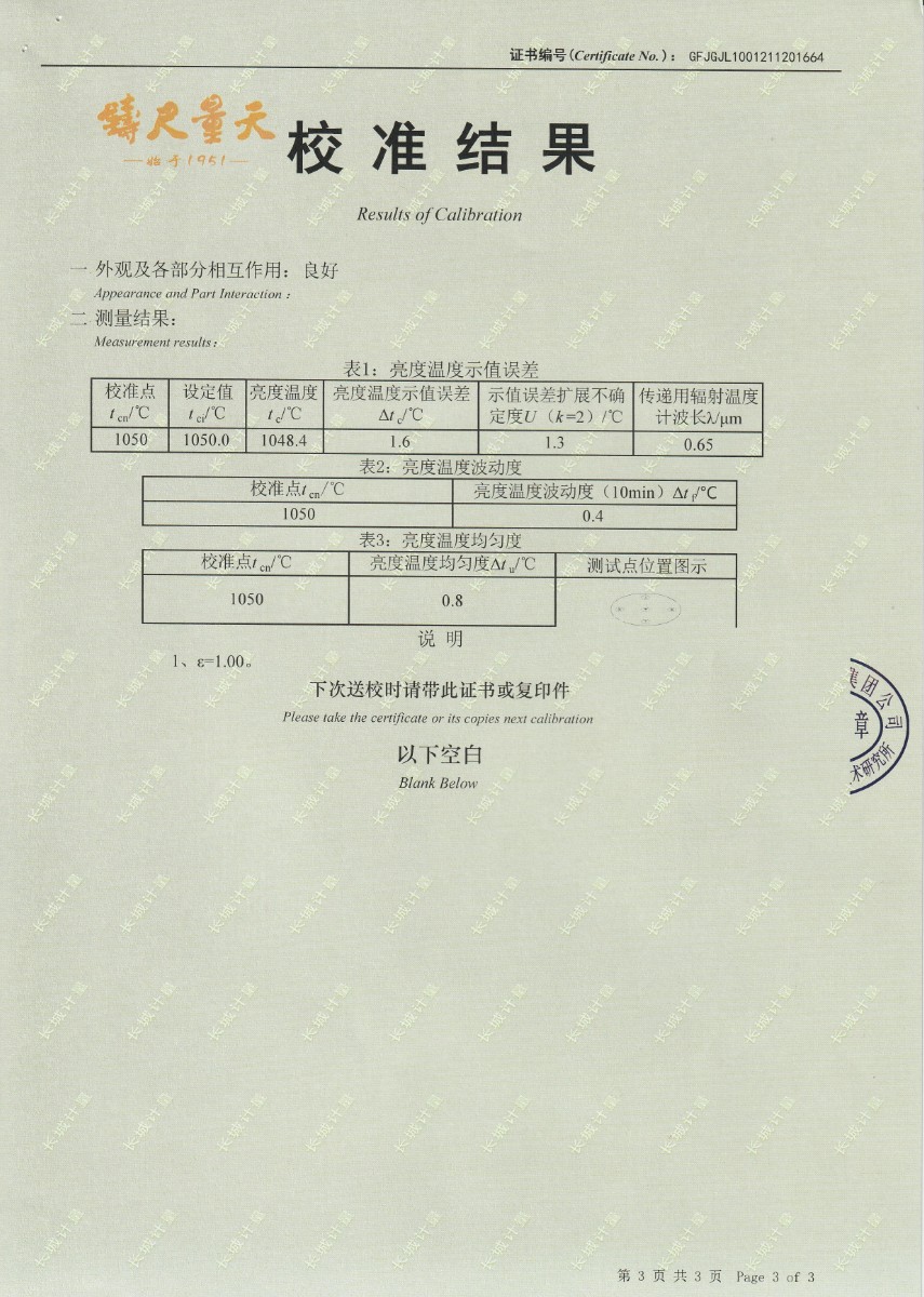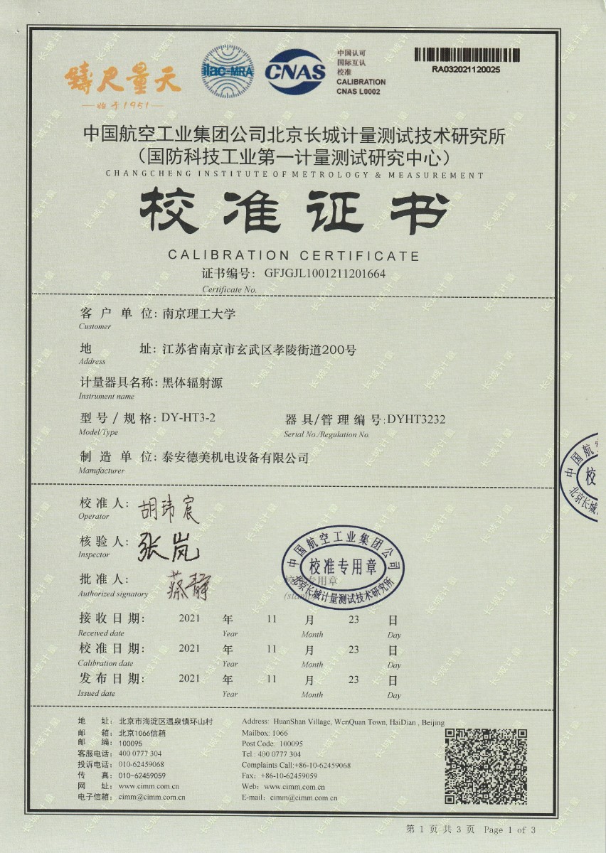 上一條:南京理工大學(xué)-黑體輻射源校準(zhǔn)證書600℃ | 下一條:超低溫面源黑體爐(-40-80℃)校準(zhǔn)證書 |