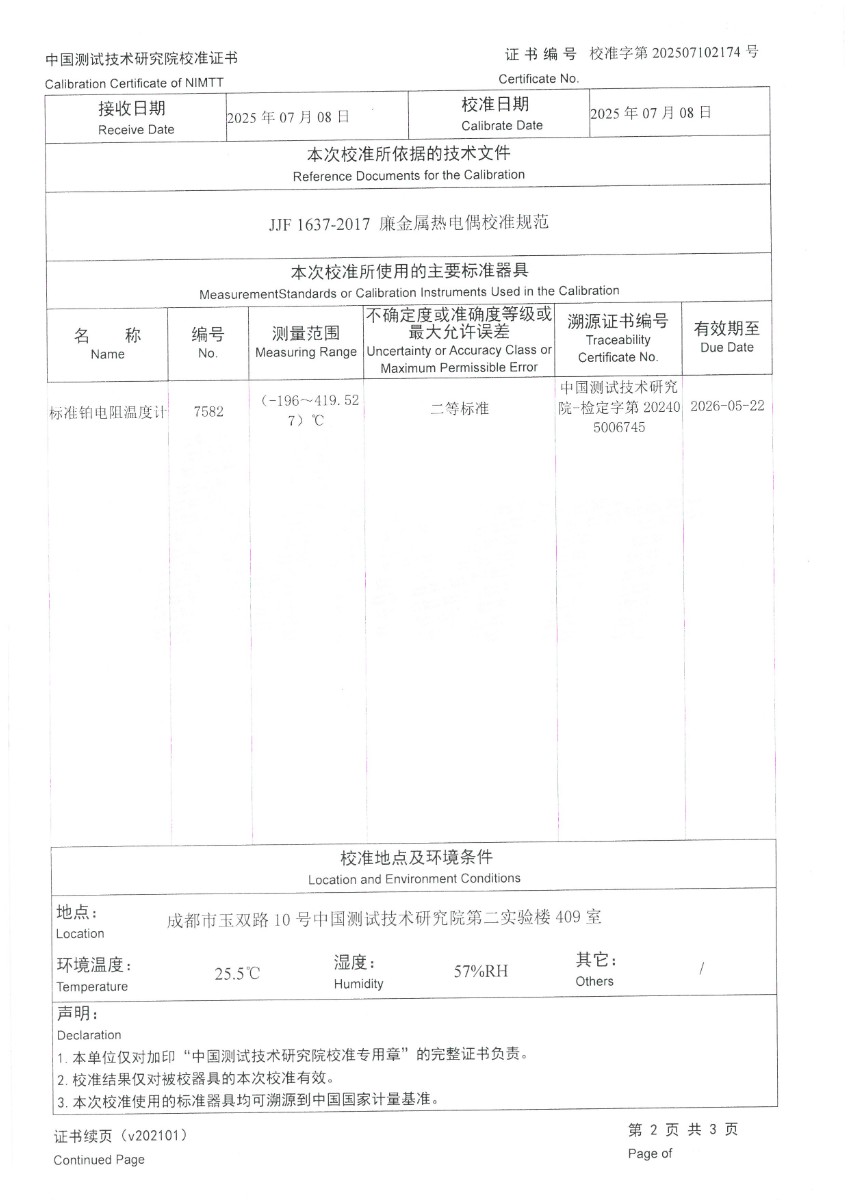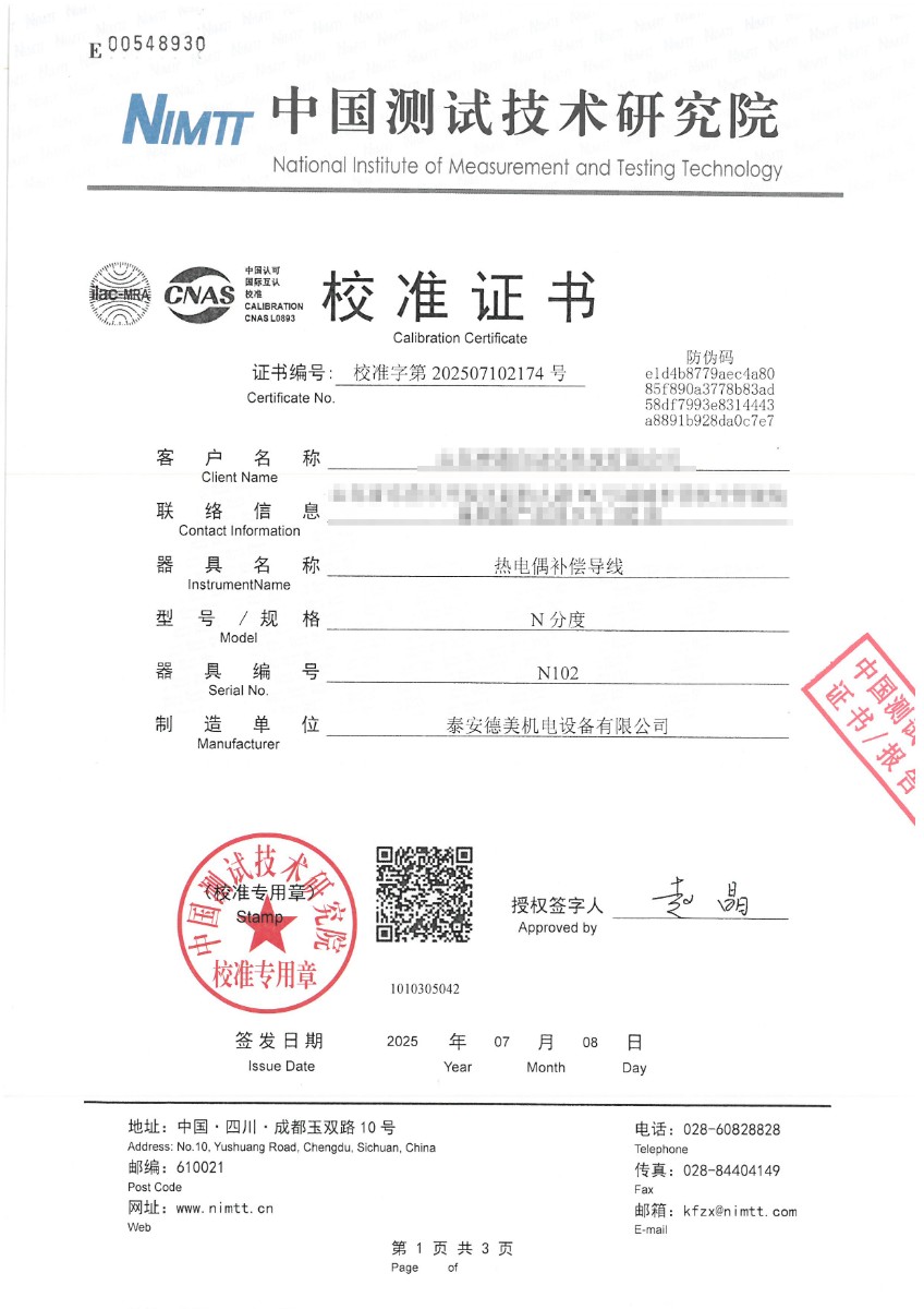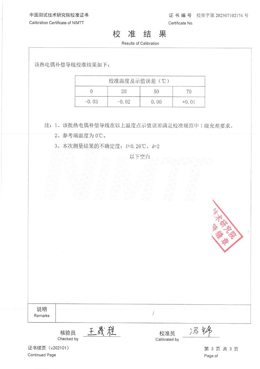 熱電偶補償導線(N分度)校準證書 2025-7-10 本文被閱讀 2036 次