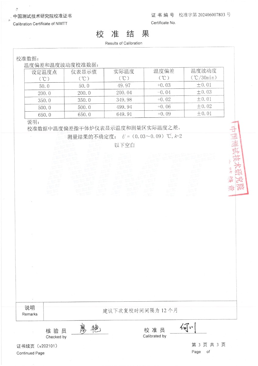 | 上一條:中溫干體爐(50~450℃)校準(zhǔn)證書(shū) | 下一條:便攜式干體爐(-30-150℃)校準(zhǔn)證書(shū) |
