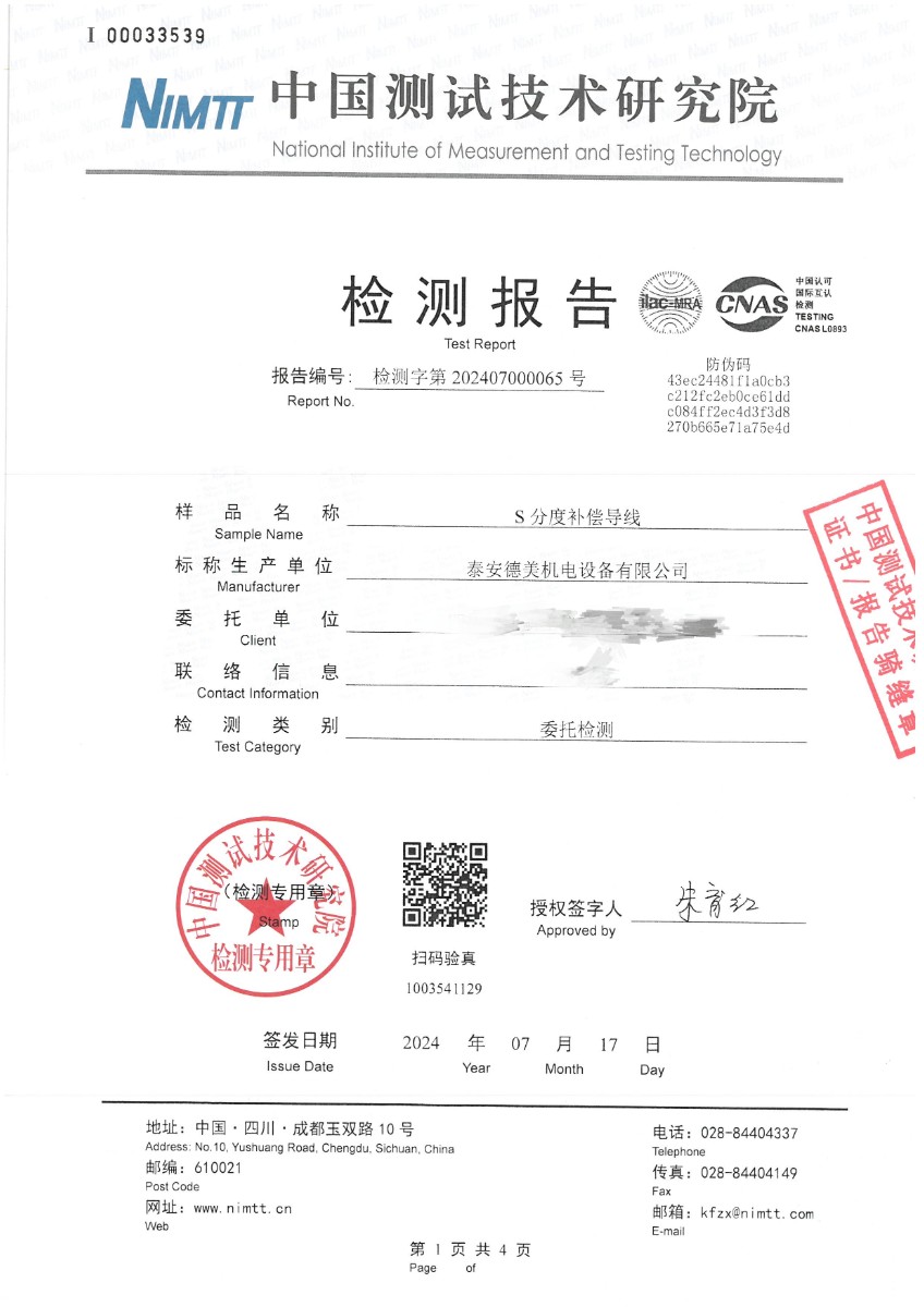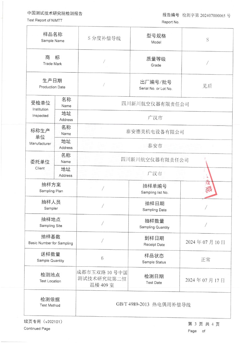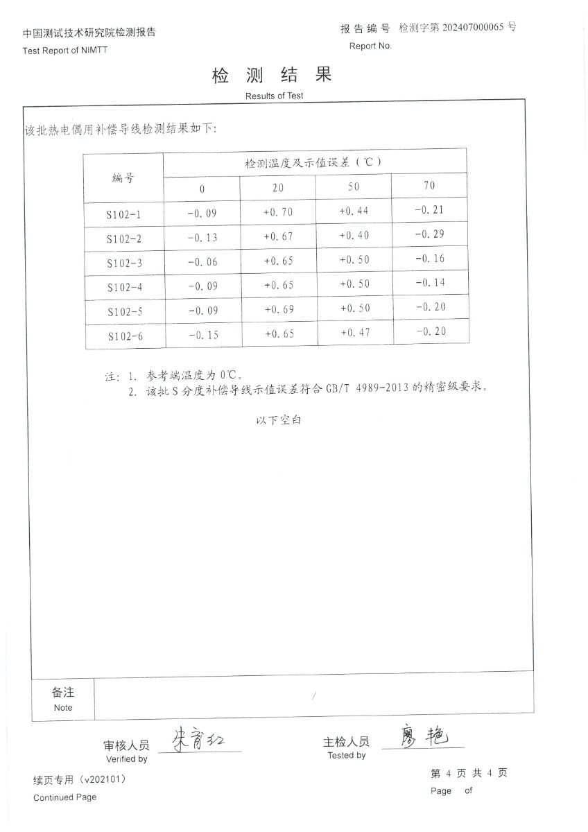 熱電偶用補償導線S分度檢測報告 2024-7-19 本文被閱讀 6783 次