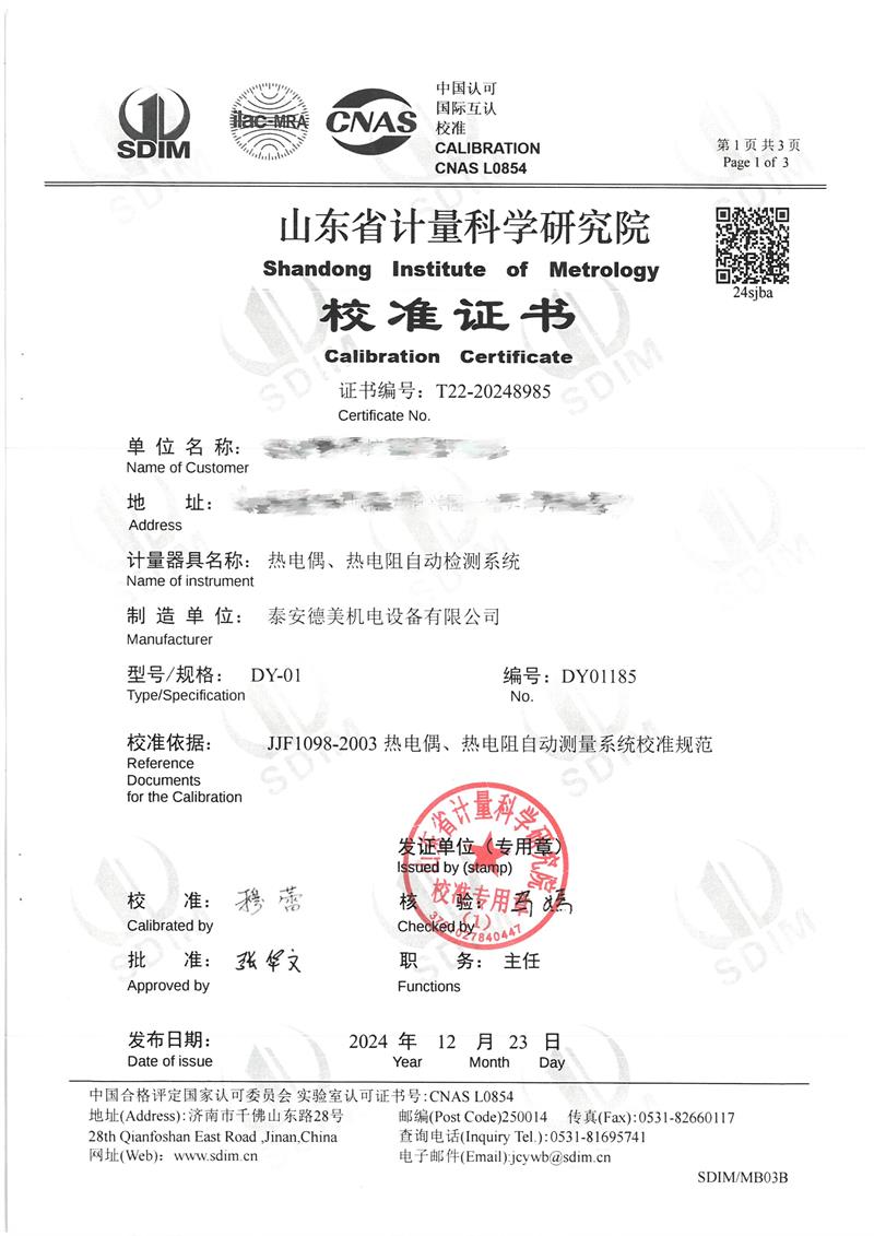 熱電偶、熱電阻自動檢測系統(tǒng)校準證書