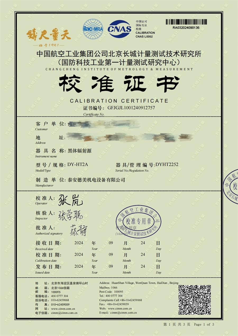 上一條:黑體輻射源(50-1200℃)校準(zhǔn)證書 | 下一條:超低溫面源黑體爐(-40-80℃)校準(zhǔn)證書 |