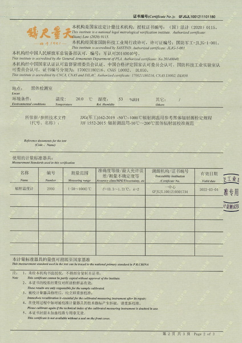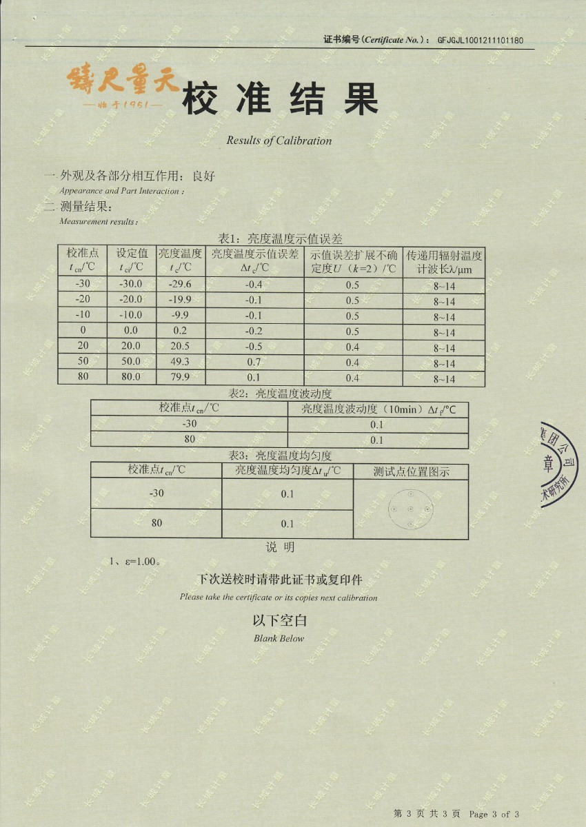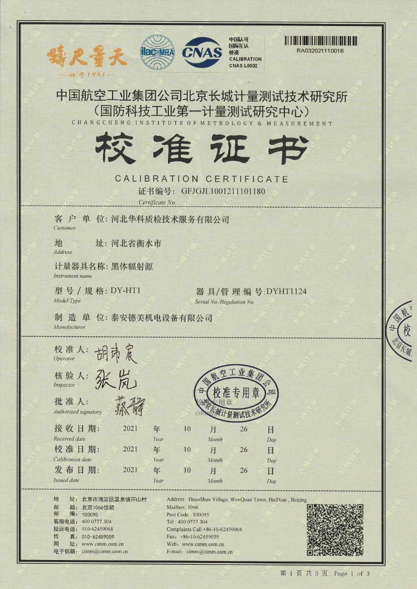 | 上一條:東營市安全工器具質(zhì)量檢測有限公司-黑體輻射源(50-500℃) | 下一條:便攜式干體爐(-30-150℃)校準(zhǔn)證書 |