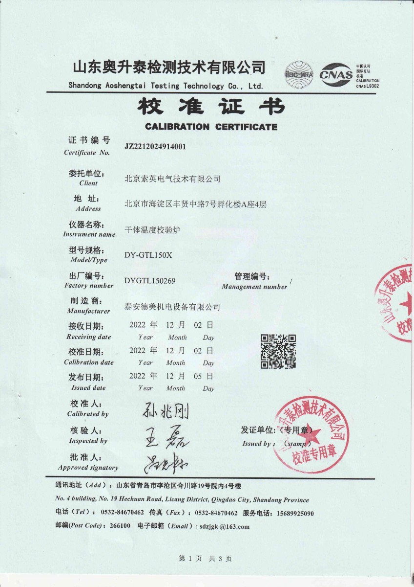 上一條:北京索英電氣技術(shù)有限公司 干體溫度校驗(yàn)爐 | 下一條:超低溫面源黑體爐(-40-80℃)校準(zhǔn)證書 |