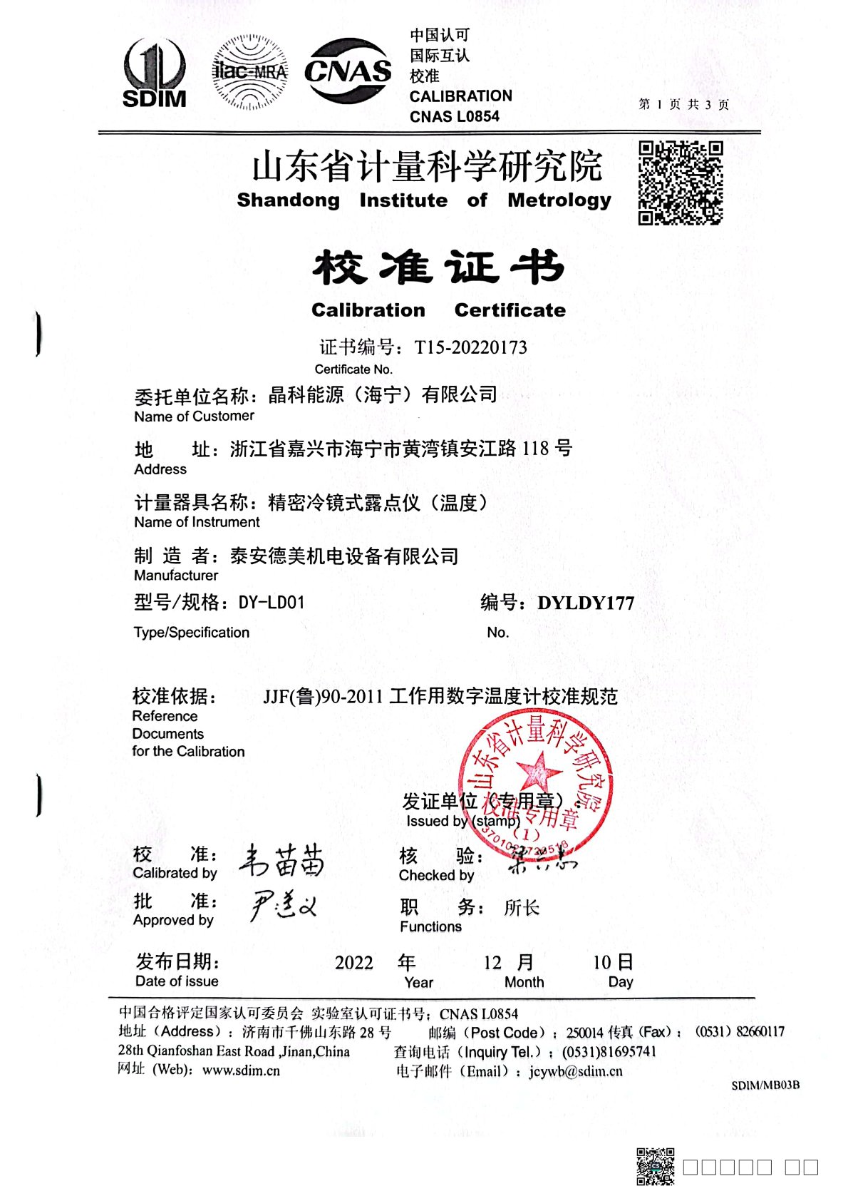上一條:晶科能源(海寧)有限公司 精密冷鏡式露點儀 檢定證書 | 下一條:超低溫面源黑體爐(-40-80℃)校準(zhǔn)證書 |