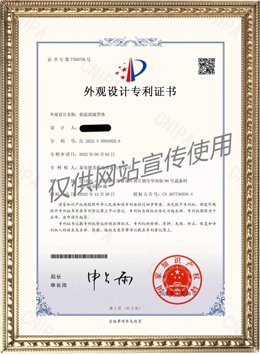 低溫面源黑體——外觀設計專利證書 2023-2-7 本文被閱讀 11792 次