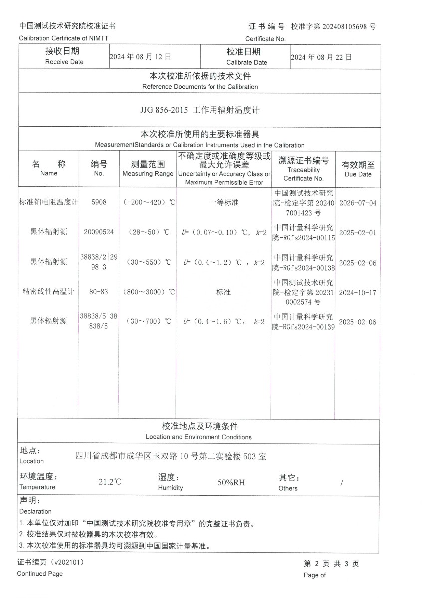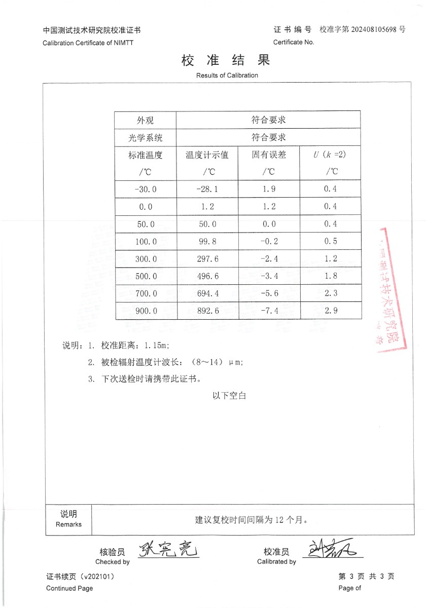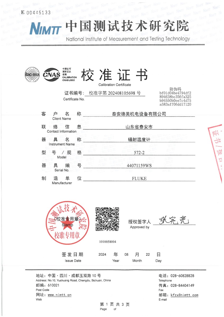 泰安德美-輻射溫度計(-30~900℃)校準證書 2024-9-9 本文被閱讀 6185 次