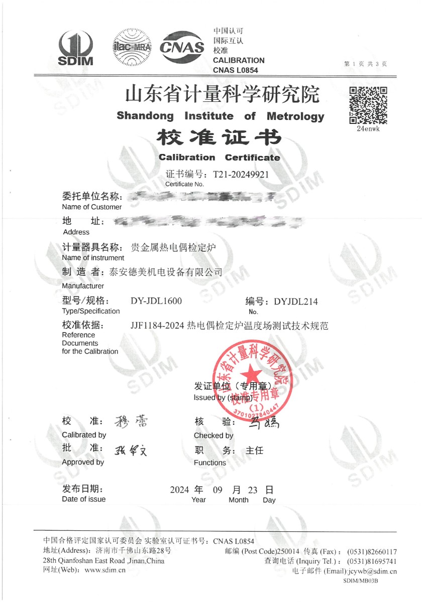 上一條:貴金屬熱電偶檢定爐(300~1000℃)校準(zhǔn)證書 | 下一條:超低溫面源黑體爐(-40-80℃)校準(zhǔn)證書 |