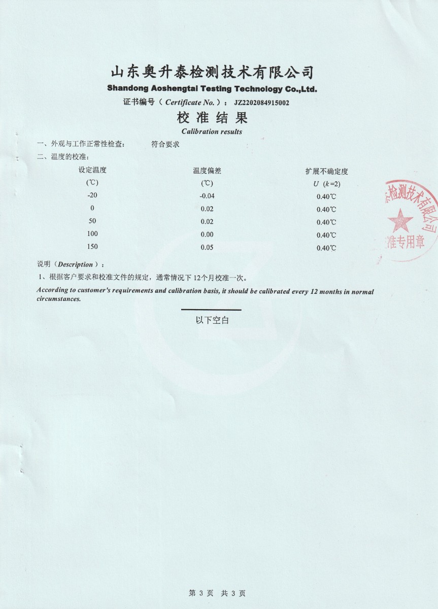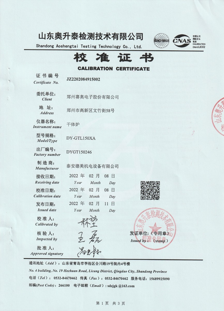 | 上一條:鄭州賽奧電子股份有限公司-干體爐DYGT150245 | 下一條:便攜式干體爐(-30-150℃)校準(zhǔn)證書 |