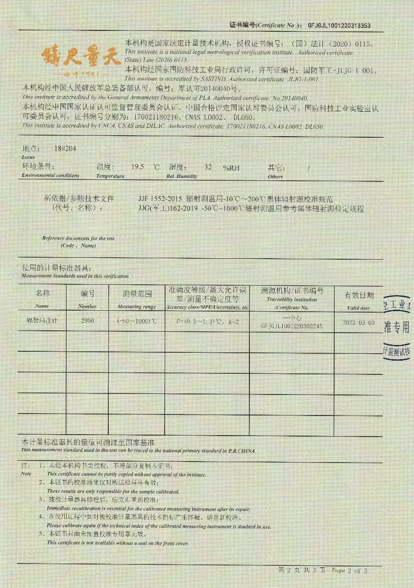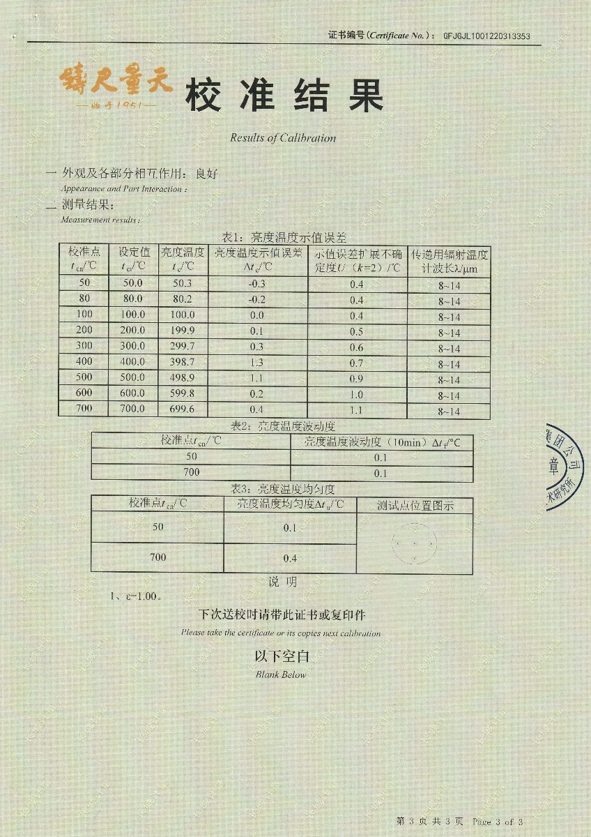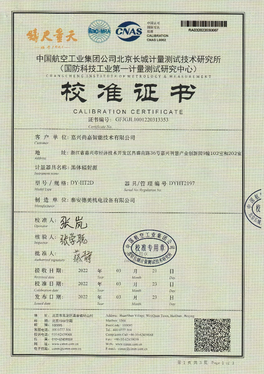 上一條:嘉興尚嘉智能技術(shù)有限公司-黑體輻射源(DY-HT1A) | 下一條:超低溫面源黑體爐(-40-80℃)校準證書 |