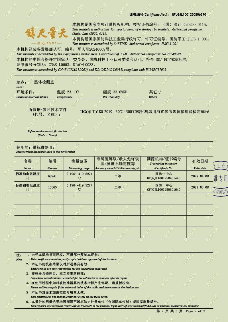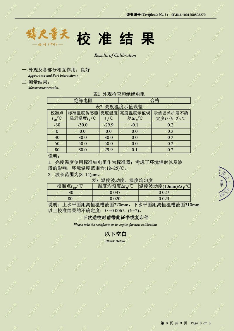 上一條:面源黑體輻射源(50-500℃)校準(zhǔn)證書 | 下一條:超低溫面源黑體爐(-40-80℃)校準(zhǔn)證書 |
